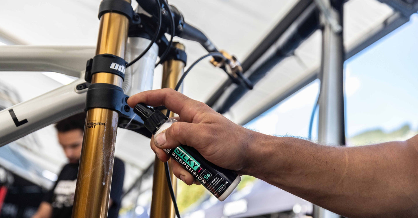 - Shake bottle to activate formula, then spray a small amount directly onto shocks, stanchions, and/or dropper post